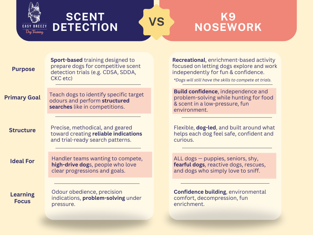 - Pairing target odour with food to create a clear scent picture for your dog